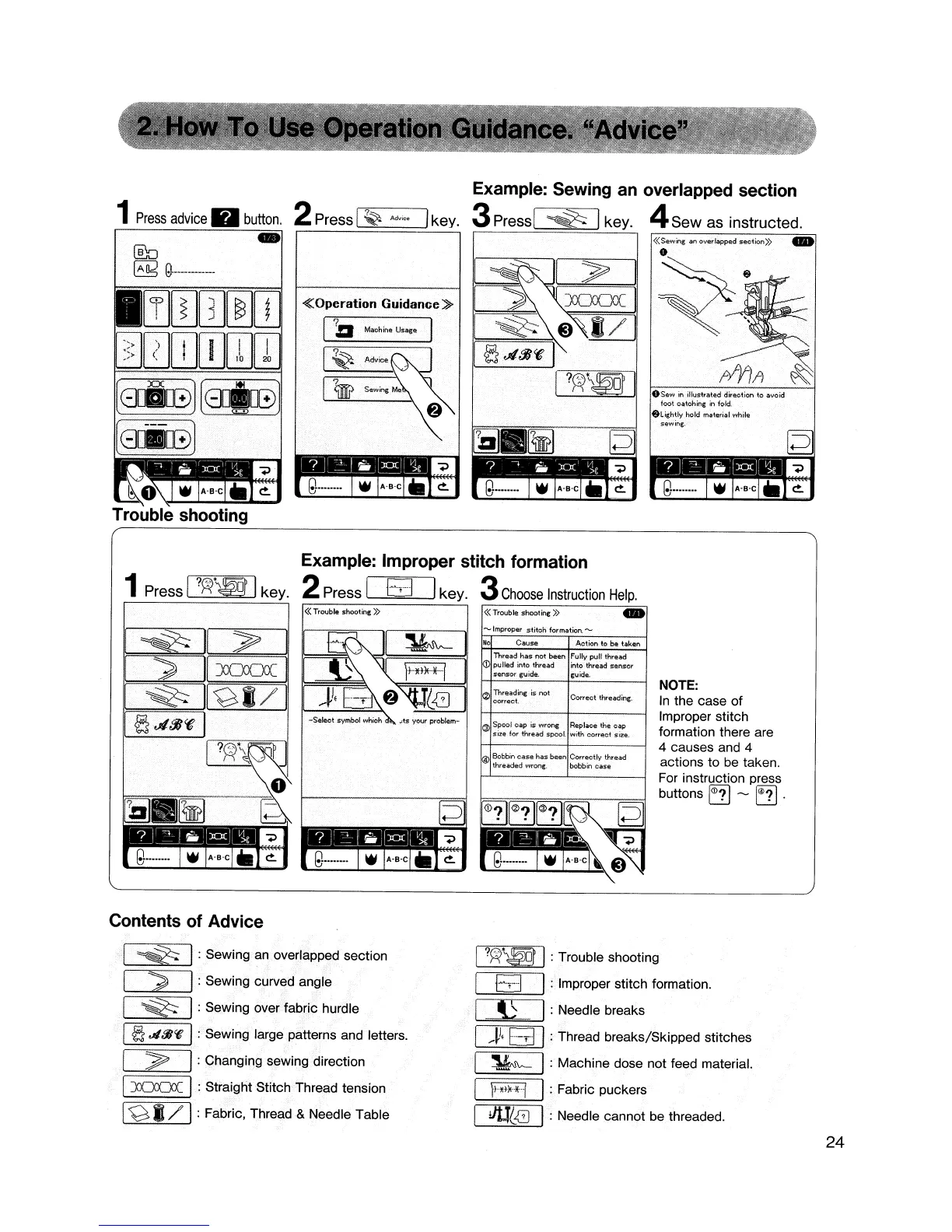 Singer XL-1000 - How to Use Operation Guidance. Advice; Contents of Advice; Example: Improper Stitch Formation; Example: Sewing an Overlapped Section