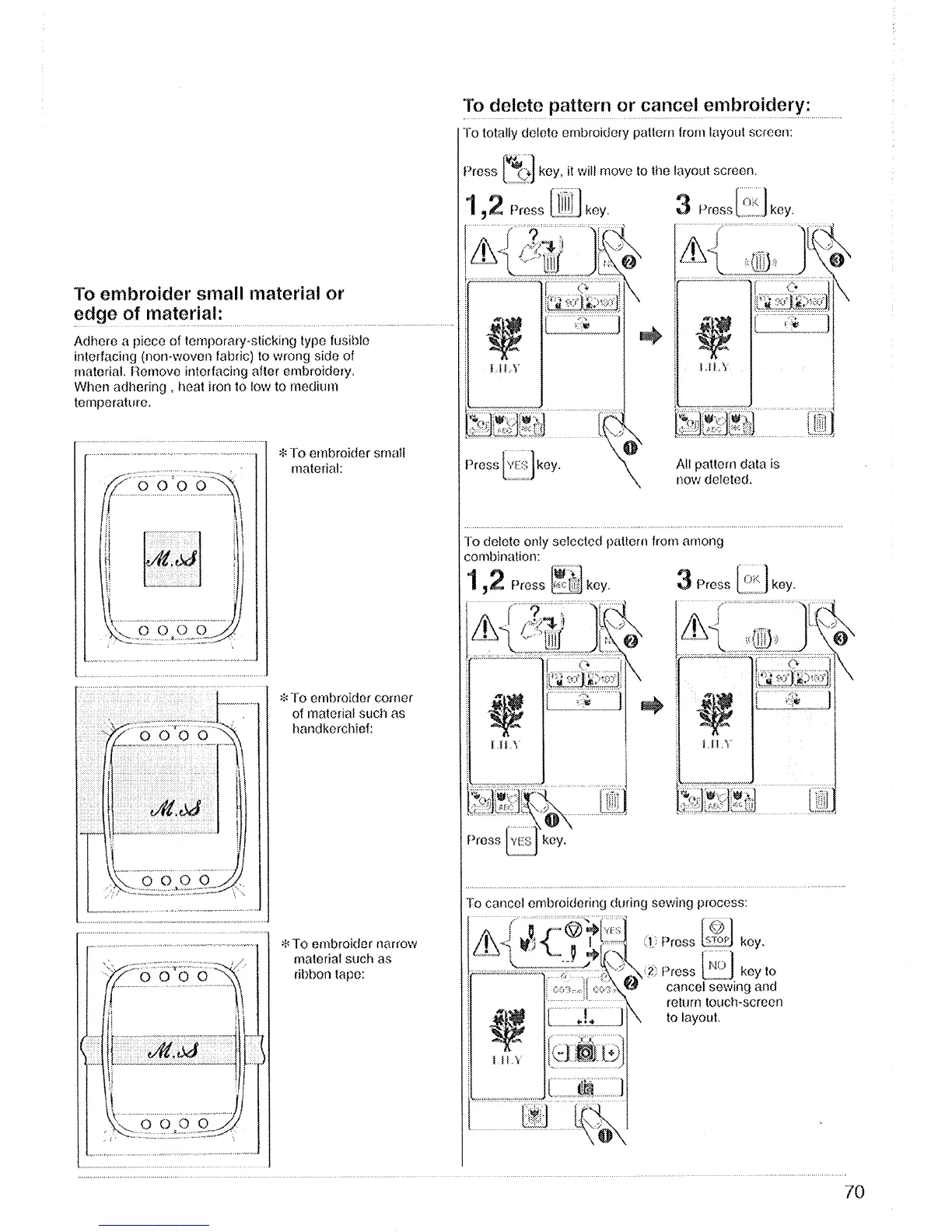 Singer XL-150 - To Embroider Small Material or Edge of Material; To Delete Pattern or Cancel Embroidery
