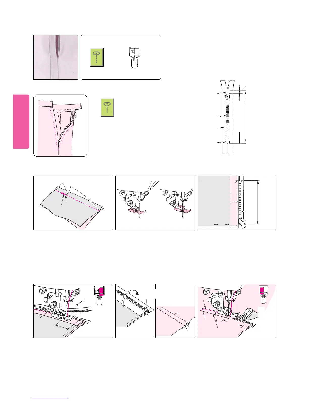 Attach zipper foot (B) to machine. Open seam allowances.