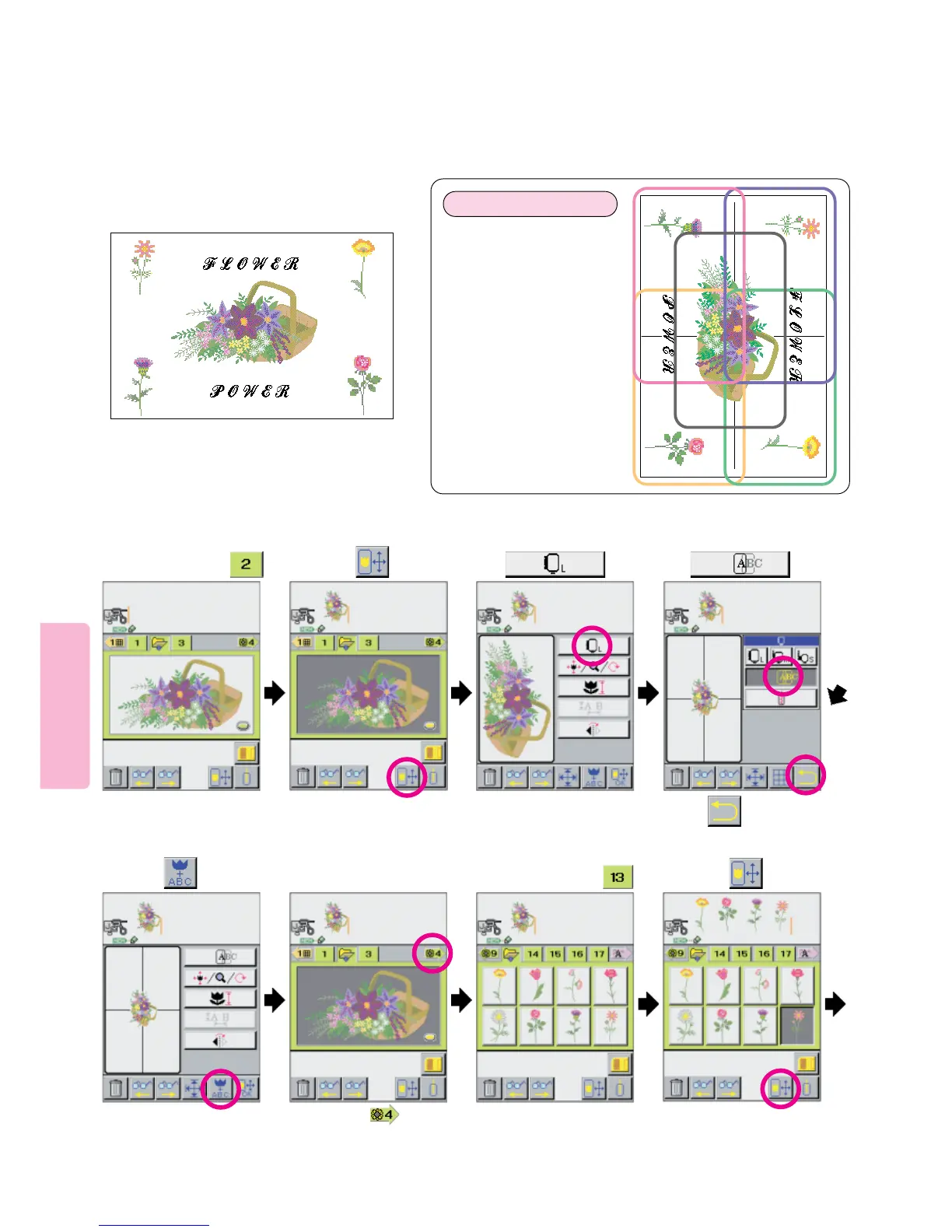 Multiple hoop embroidery may also be easily sewn by joining 4 or more adjacent hoopings. The following instructions and