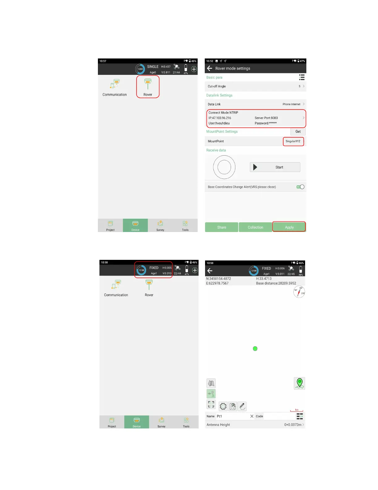After connection, it will show a icon in the software as Rover, click and set CORS parameters: IP, Port, User,