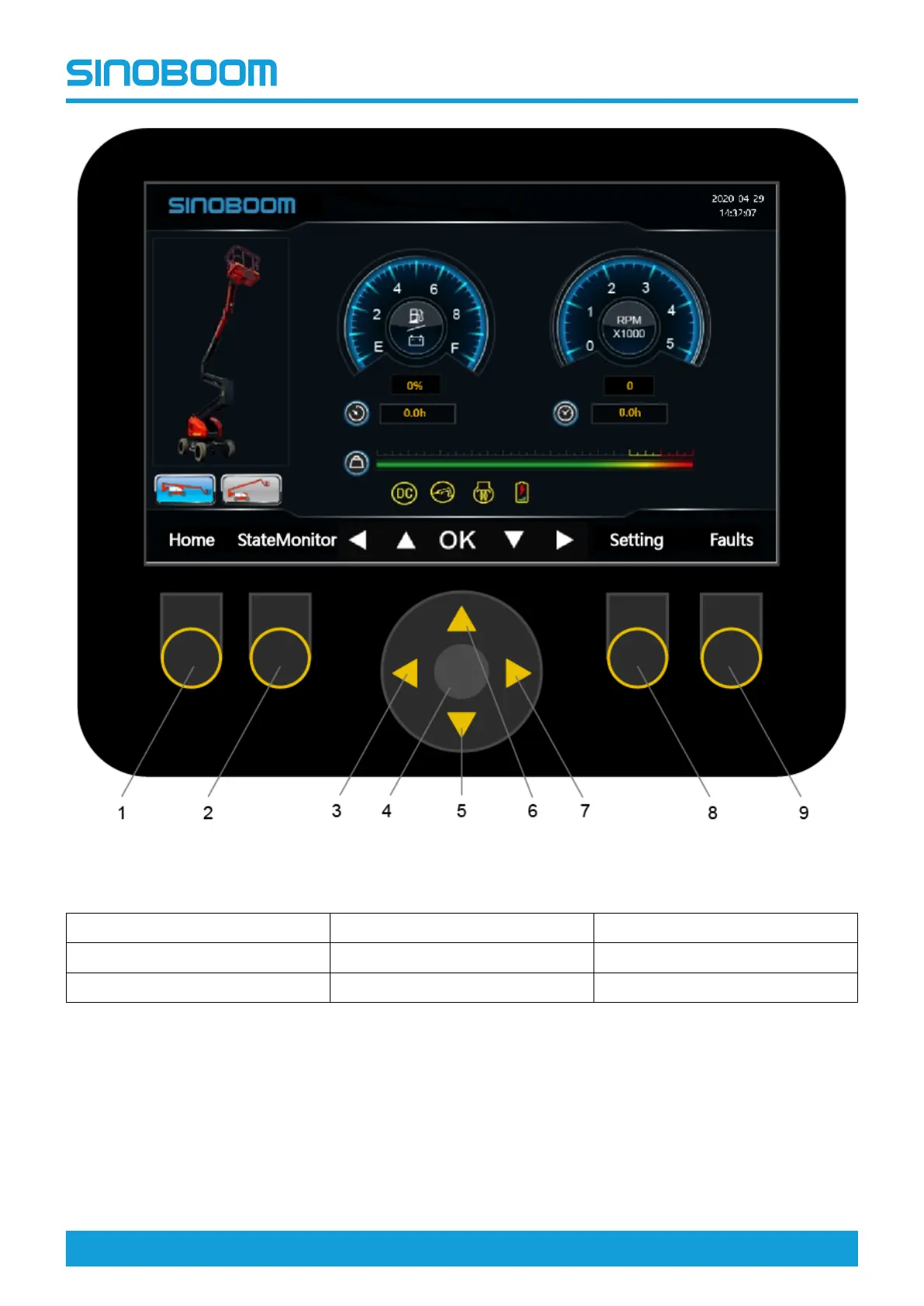 2. State monitor/next page 5. Down shift key 8. Setting