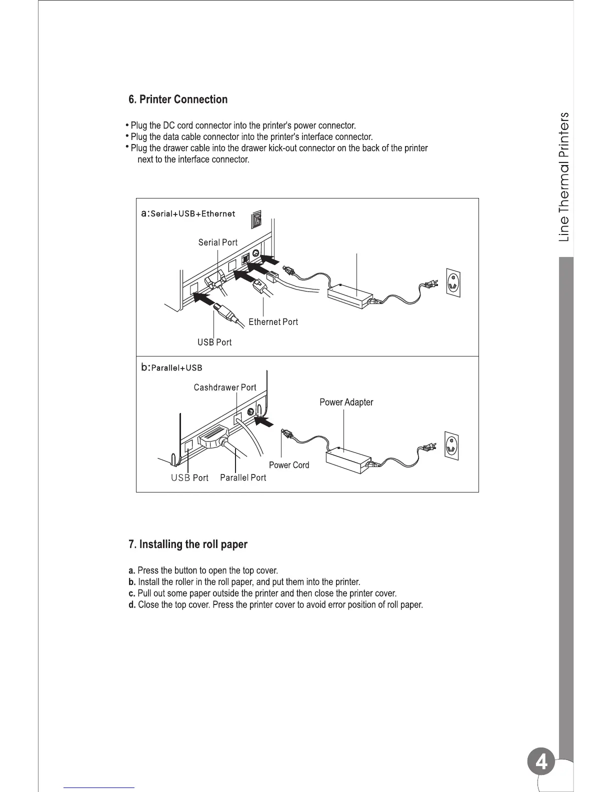 Sinocan P11-USL - 6. Printer Connection; Connecting power, data, and cash drawer cables; 7. Installing the roll paper; Steps for opening cover and loading paper roll