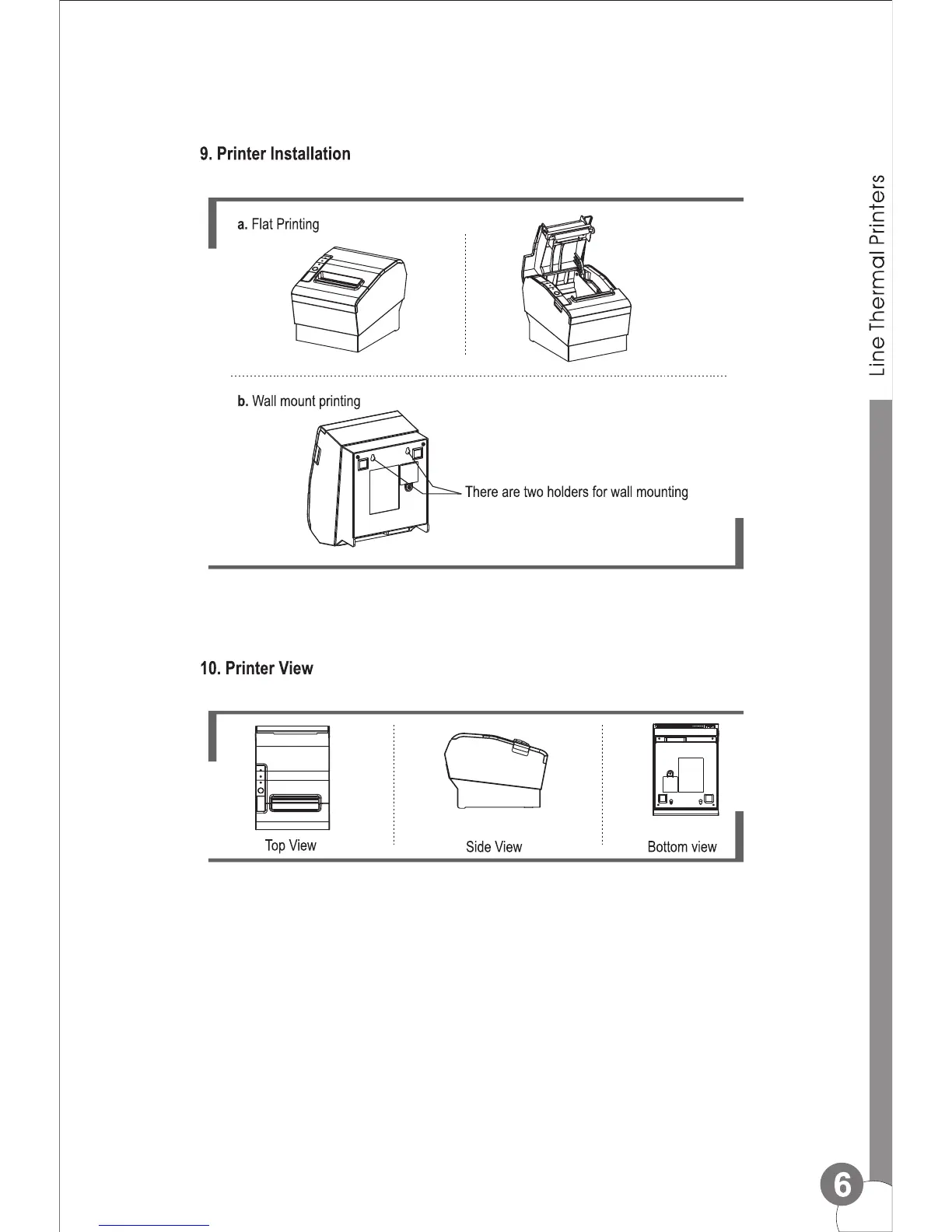Sinocan P11-USL - 9. Printer Installation; Flat and wall mount installation methods; 10. Printer View; Top, side, and bottom views of the printer