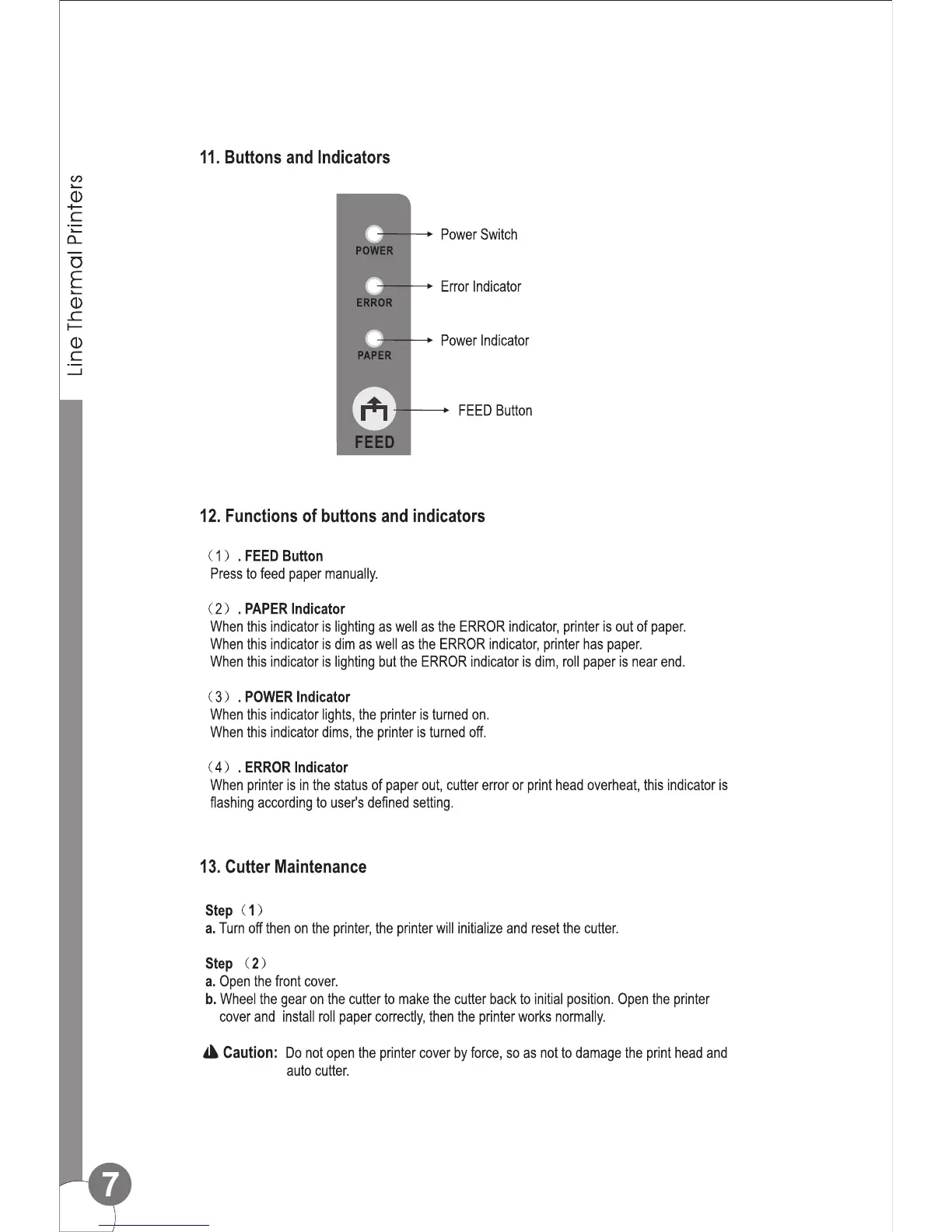 Sinocan P11-USL - 11. Buttons and Indicators; Power switch, error, paper, and feed buttons identified; 12. Functions of buttons and indicators; FEED button for manual paper feeding