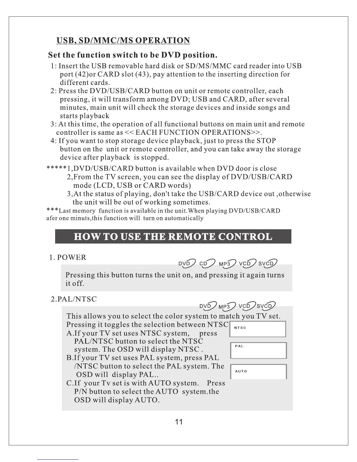 Sinotec PC-9203DVD - How to Use the Remote Control; Power; Pal;Ntsc; Set the Function Switch to be DVD Position