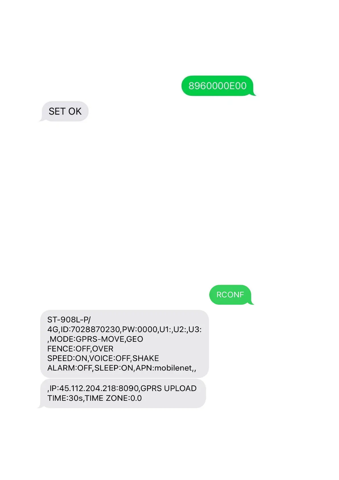 Reply: the ID, work mode, IP and Port, APN of tracker.