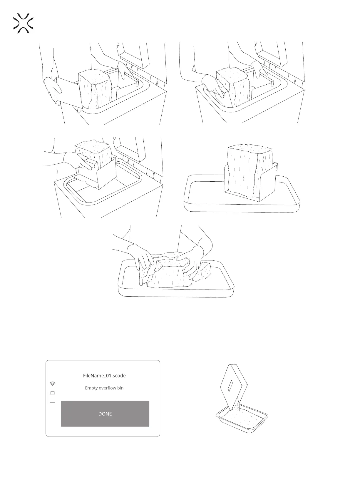 5. Remove the unsintered powder from the OVERFLOW BIN. Press Unlock Overow Bin button on the LCD