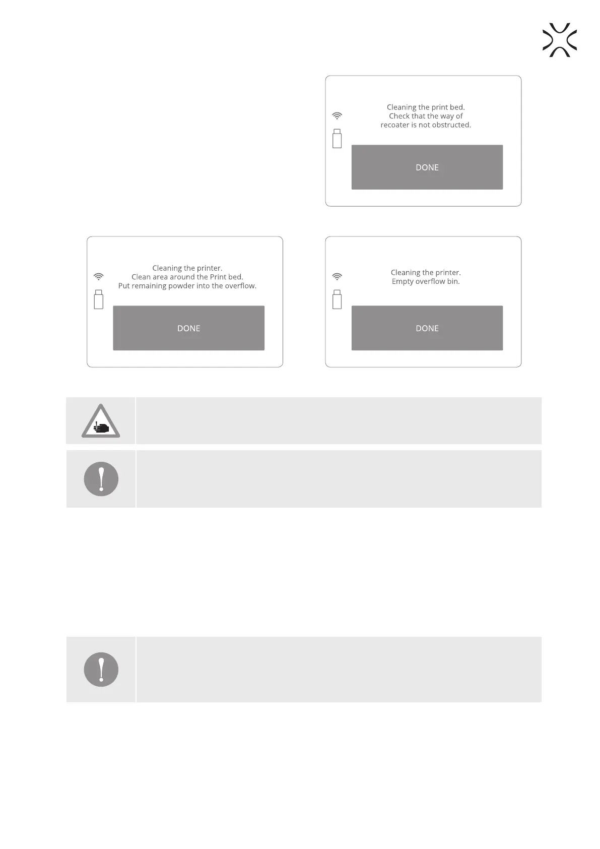 Image 42. Clean the PRINT BED screen 4. Image 43. Clean the OVERFLOW BIN screen.