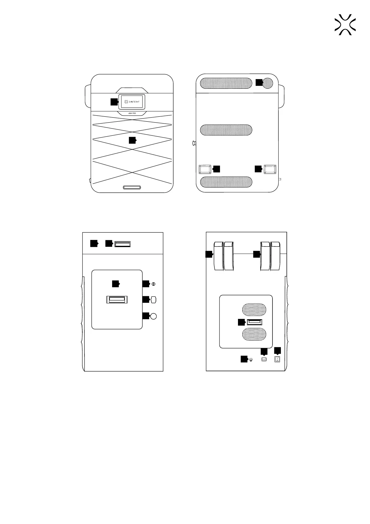 5.Printer lid / 6.Lid handle / 7.Overow Bin / 8.USB port / 9.Key slot / 10.Safety button (E-STOP) / 11.Lid hinges /
