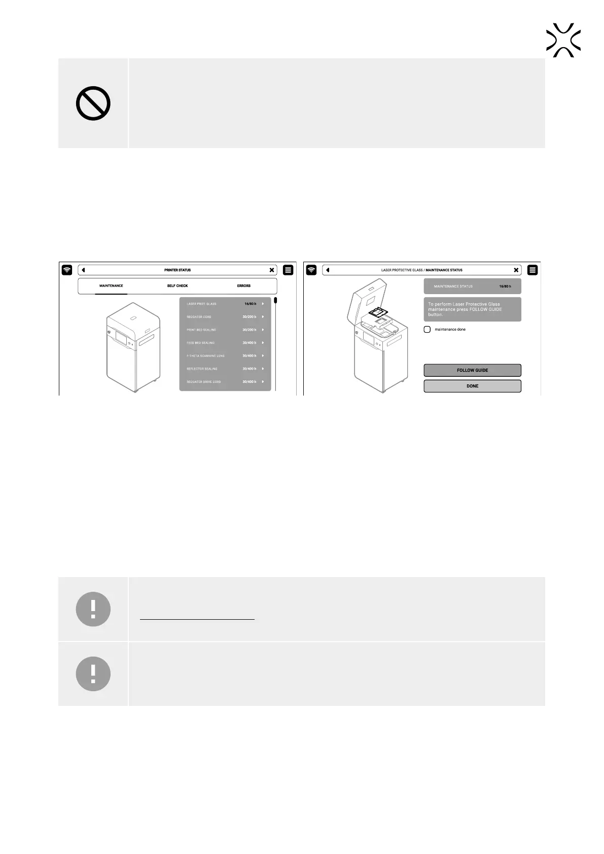 1. On the PRINTER STATUS tab, select the Laser protective glass position (g. 12.6).