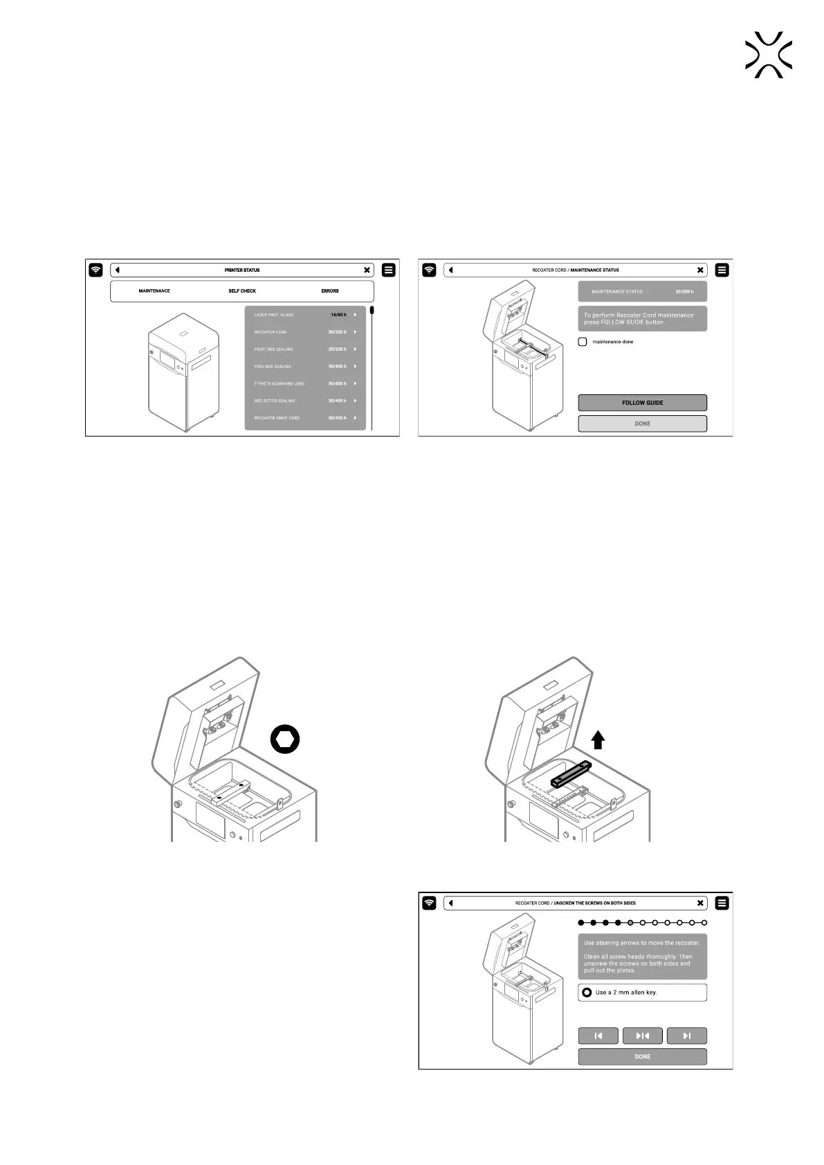2. The Recoater cord maintenance tab will appear on the screen. You can use the step-by-step guide (press FOLLOW