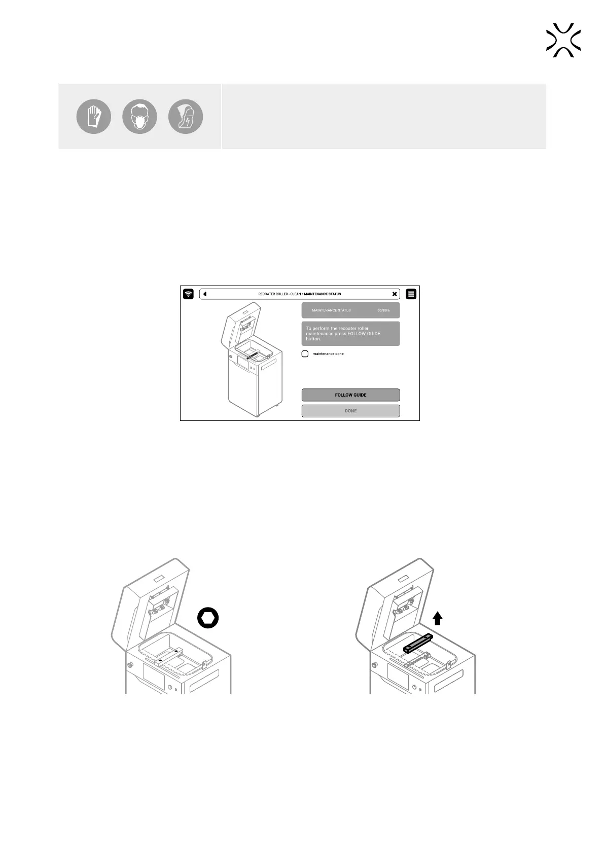 2. The maintenance tab of the cleaning Recoater roller will appear on the screen. You can use the step-by-step guide