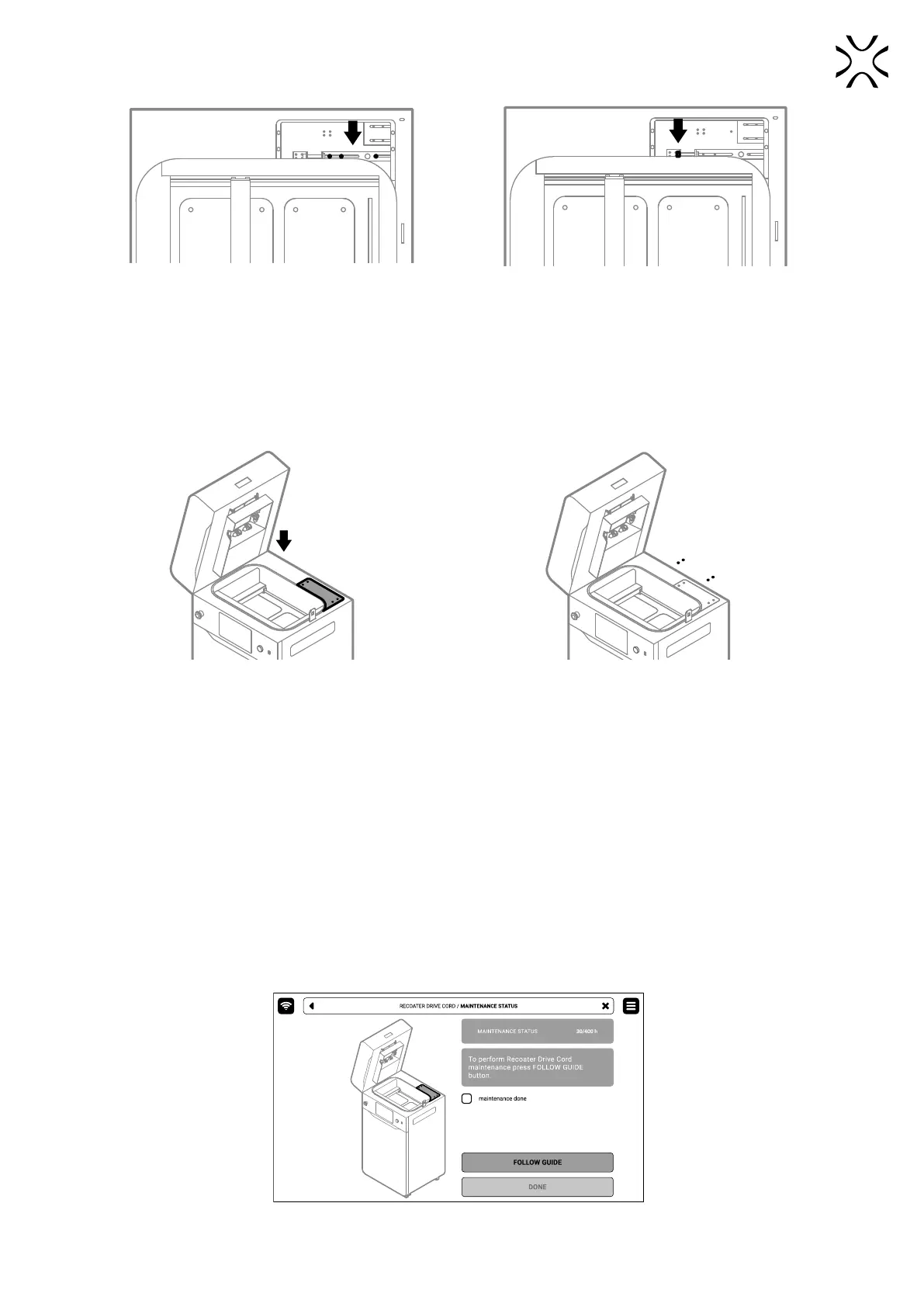 Every approx. 400 hours is required to check the tension of the Recoater Drive Unit Cord. A properly tensioned cable is