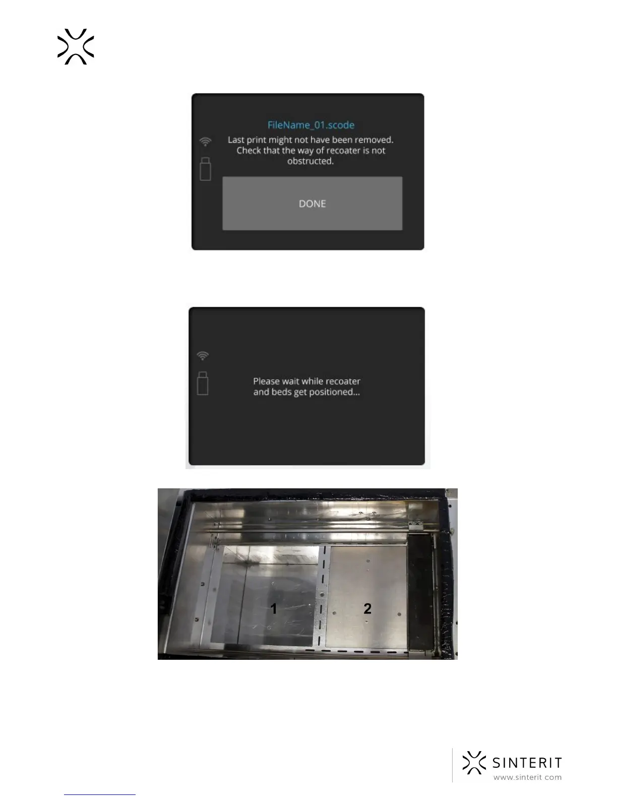 6. By clicking “DONE” the Recoater and the Beds will be repositioned. During this operation,