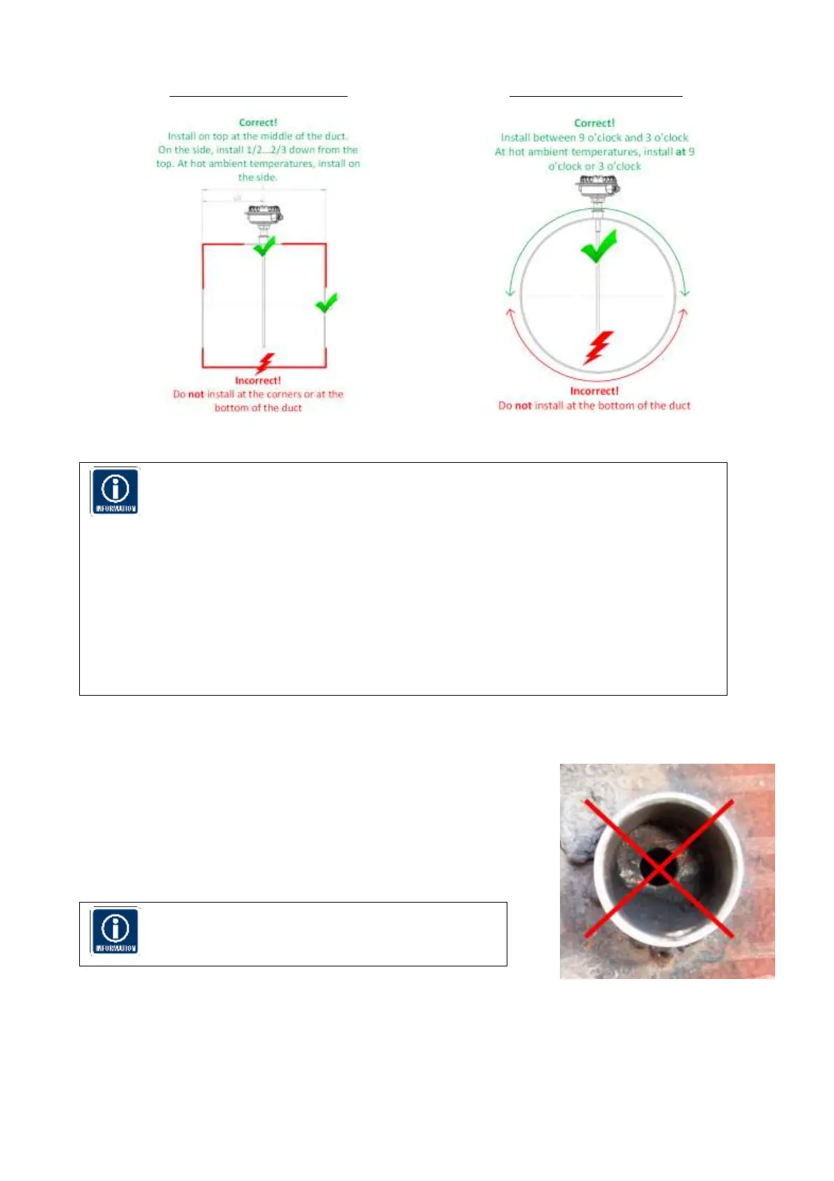 The sensor must not contact the opposite wall or any other obstacle inside the duct.