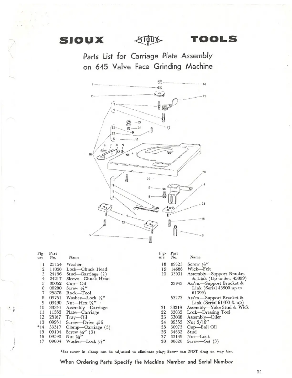 Sioux Tools 645 - Parts List for Carriage Plate Assembly
