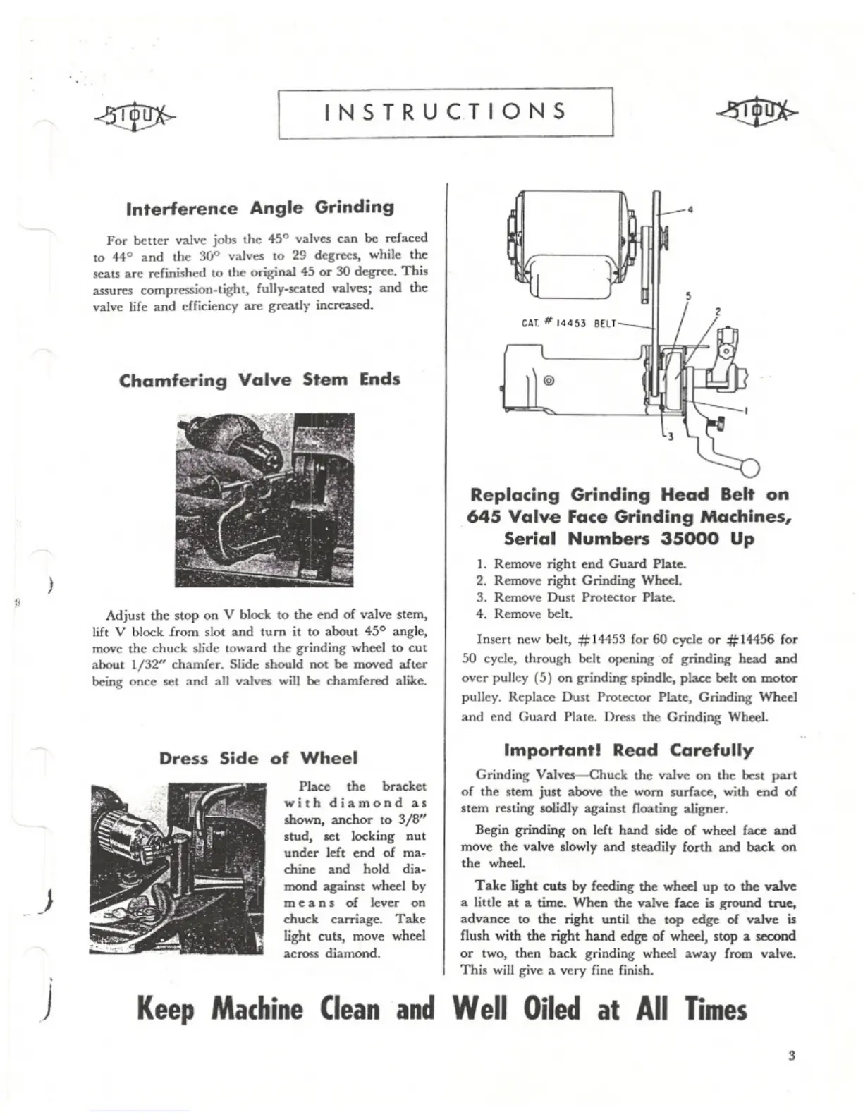 Sioux Tools 645 - Interference Angle Grinding; Replacing Grinding Head Belt on 645 Valve Face Grinding Machines; Grinding Valves