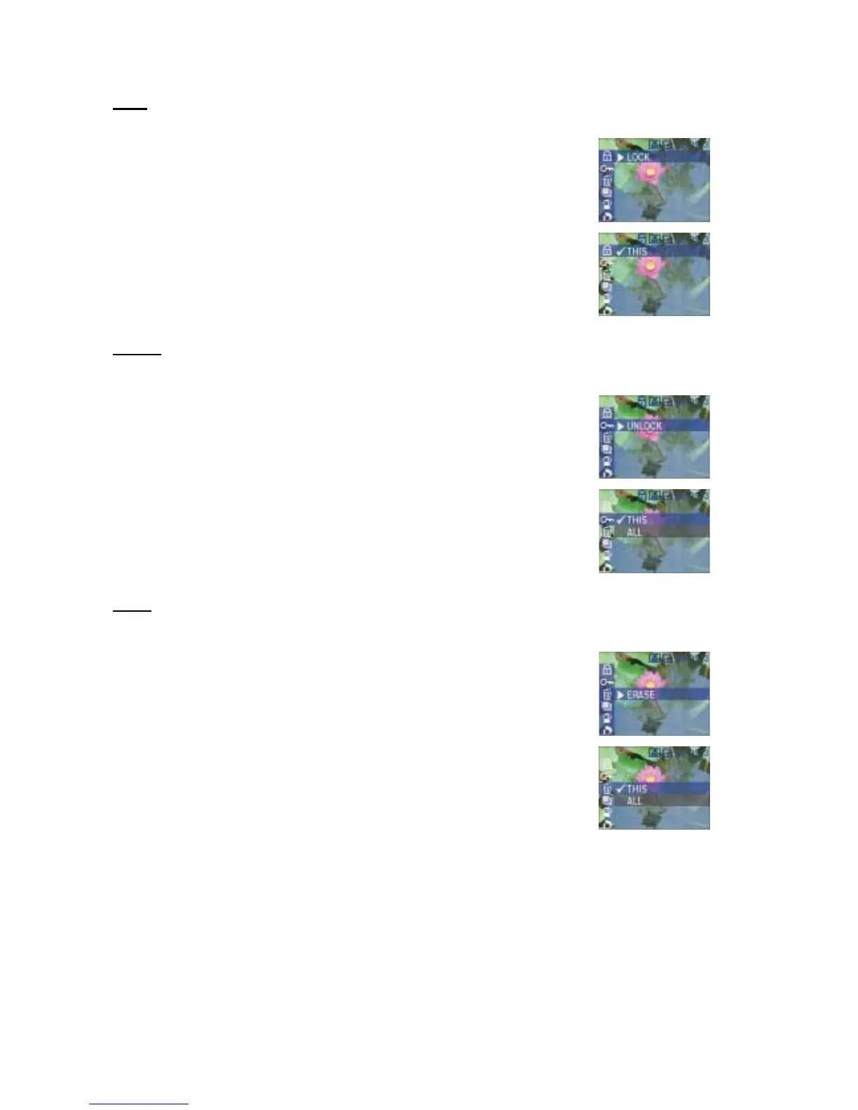 This selection allows you to erase the current picture or to erase all stored pictures