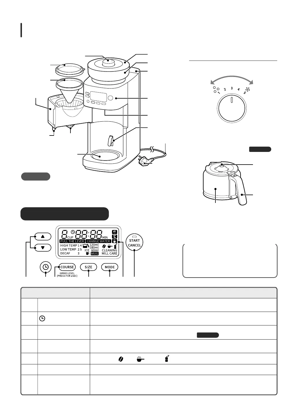 tekan untuk memilih jumlah cangkir ,waktu, pengaturan waktu (program), dan pengaturan