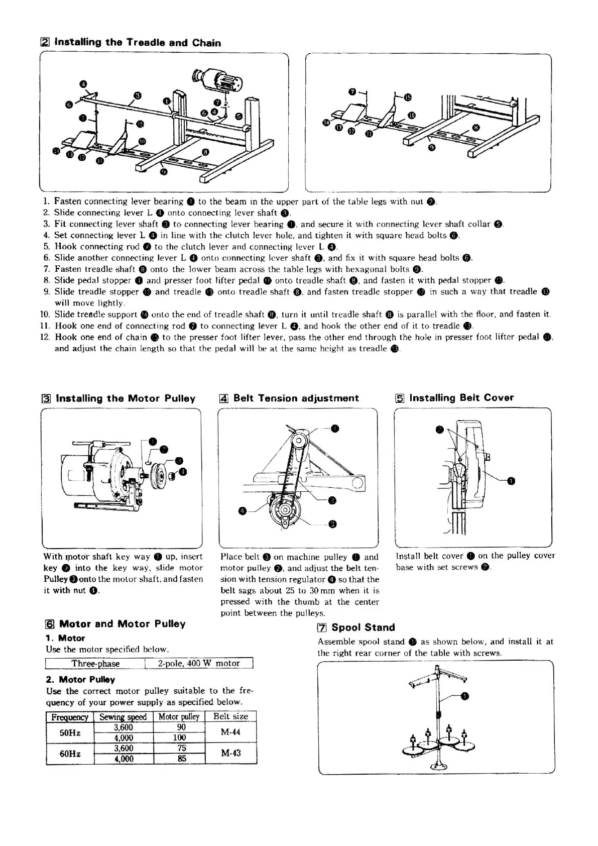Siruba FA007 - 121 Installing the Treadle and Chain; Belt Tension Adjustment; 161 Motor and Motor Pulley; Spool Stand