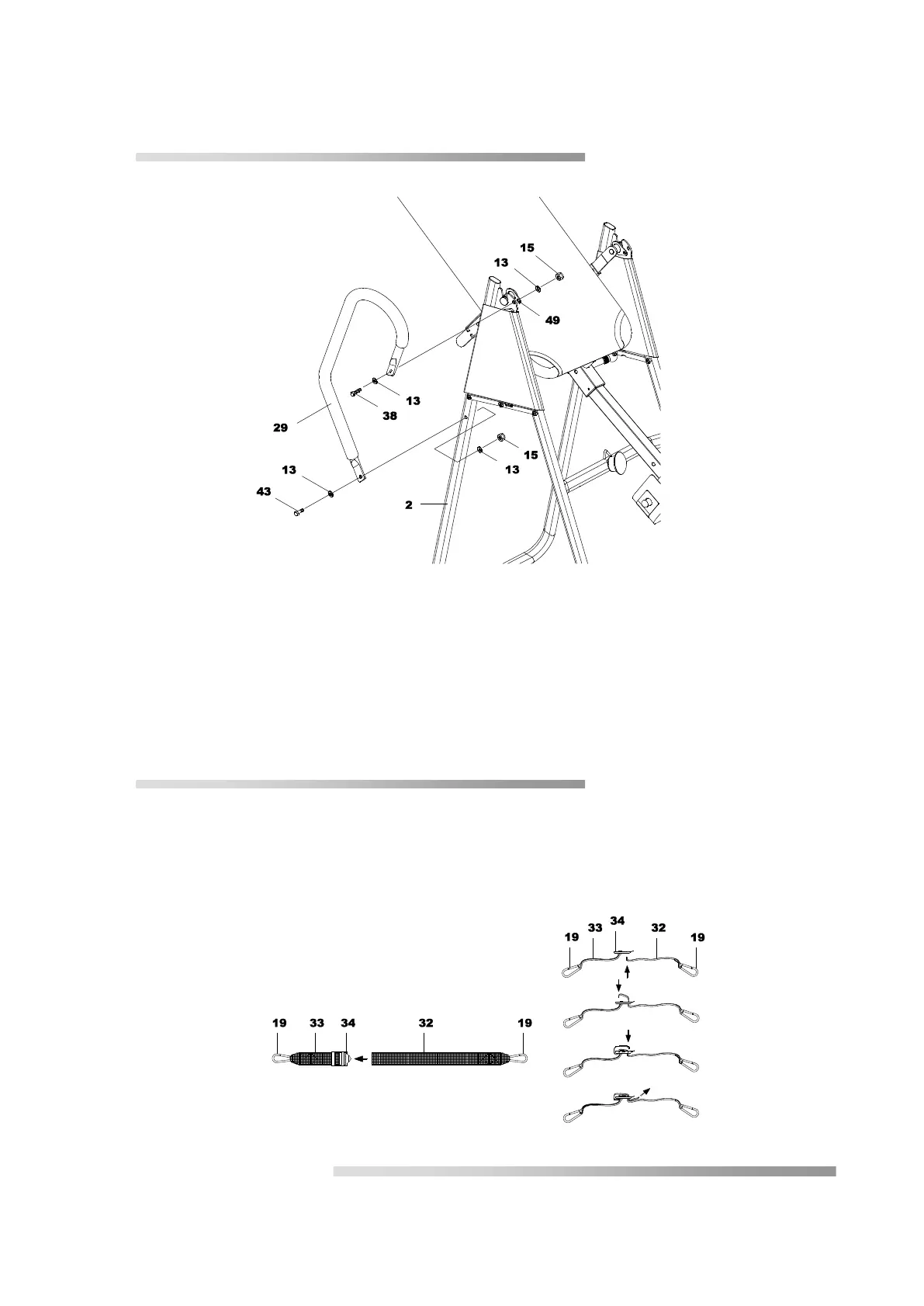 Fasten the lower end of the bar grip (29) on the rear U-frame (2) using a hex-head screw (43), a
