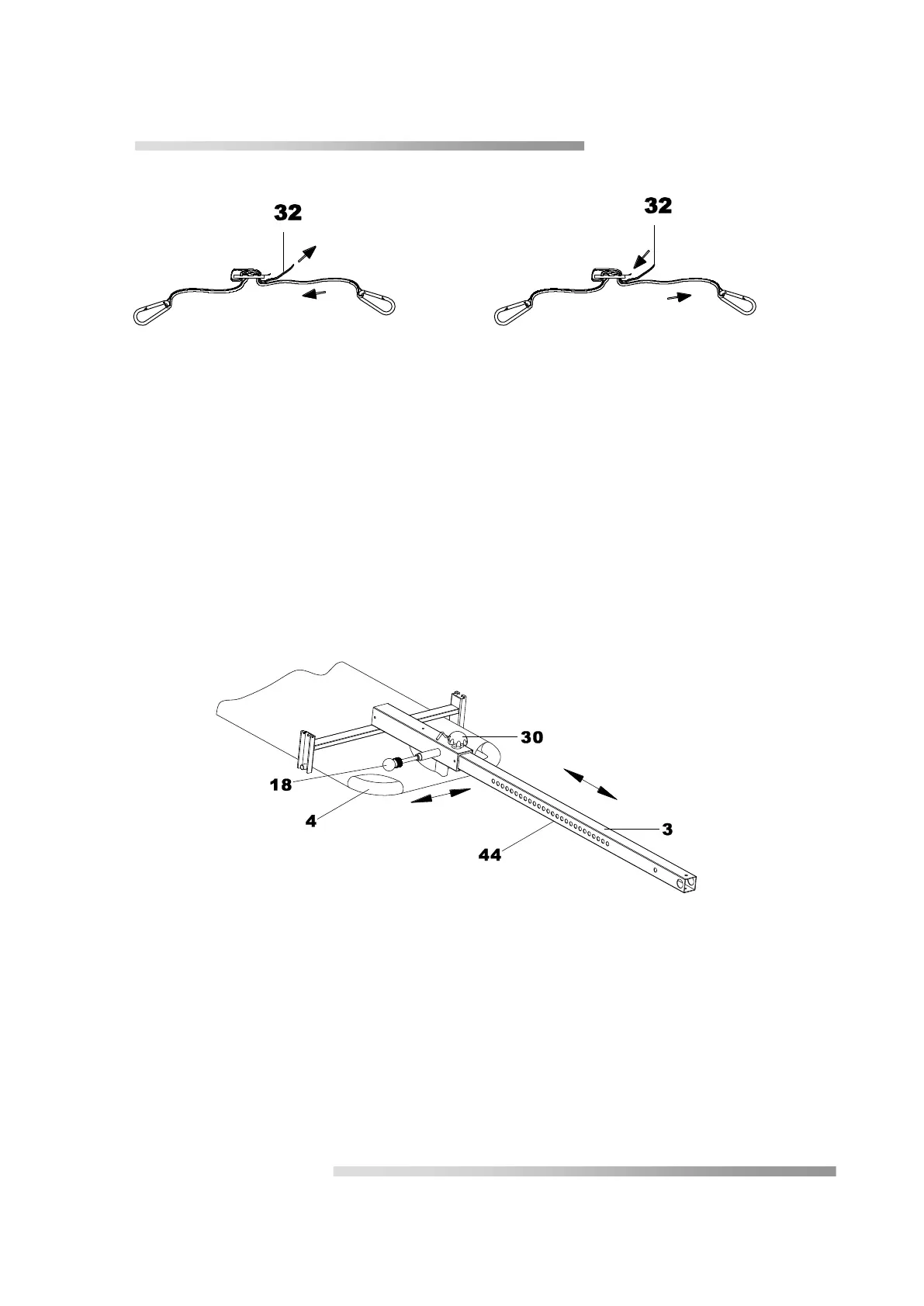 2. To lengthen the strap (32), thread it into the upper end of the strap buckle and pull at the