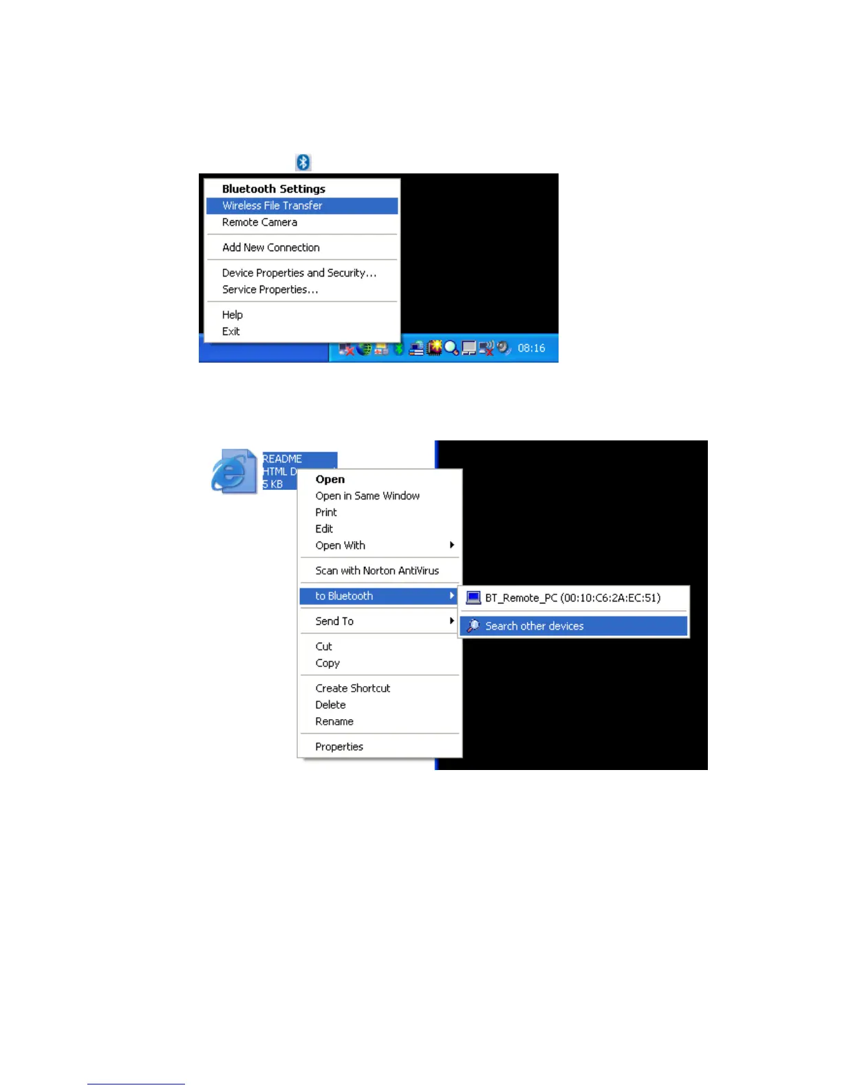 right click a file allows you to select ‘to Bluetooth’ -> ‘Search other
