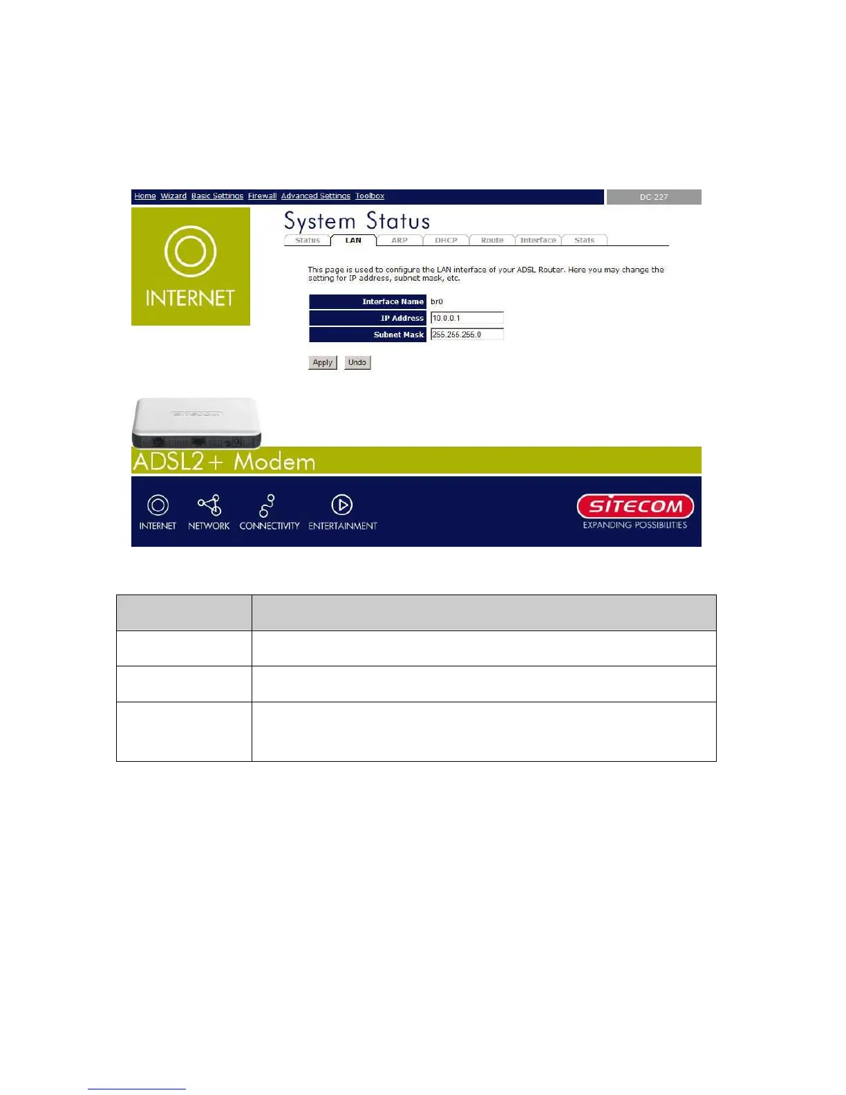 This page shows the current setting of LAN interface. You can set IP address, subnet mask,
