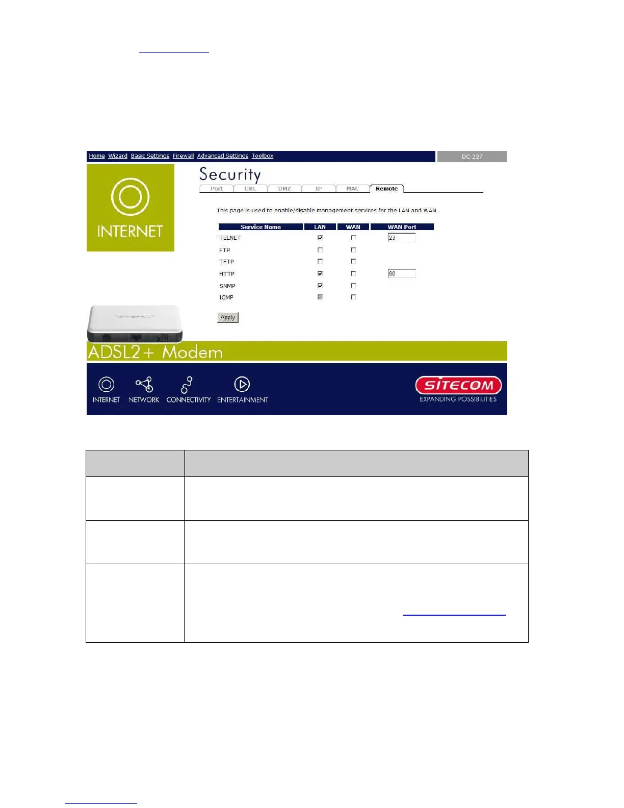 The Remote Access function can secure remote host access to your DSL device from LAN and