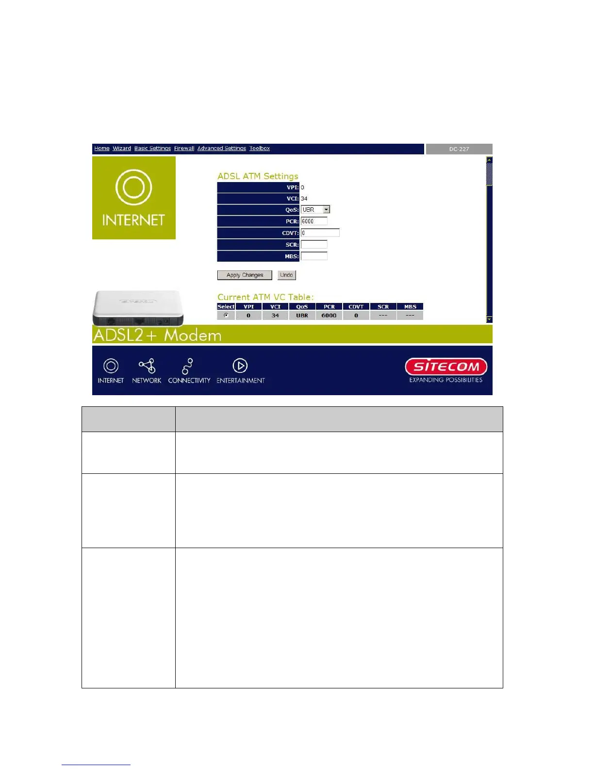 The page is for ATM PVC QoS parameters setting. The DSL device support 4 QoS