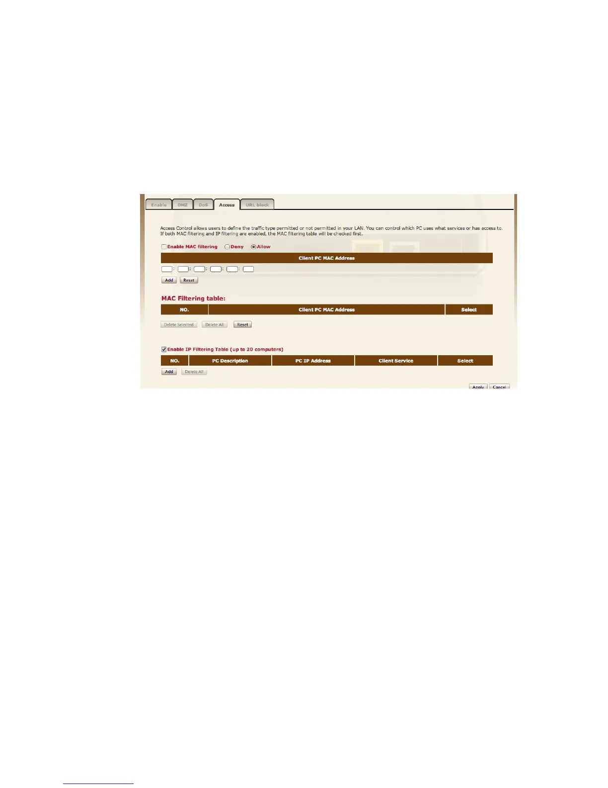 Deny If you select “Deny” then all clients will be allowed to access Internet