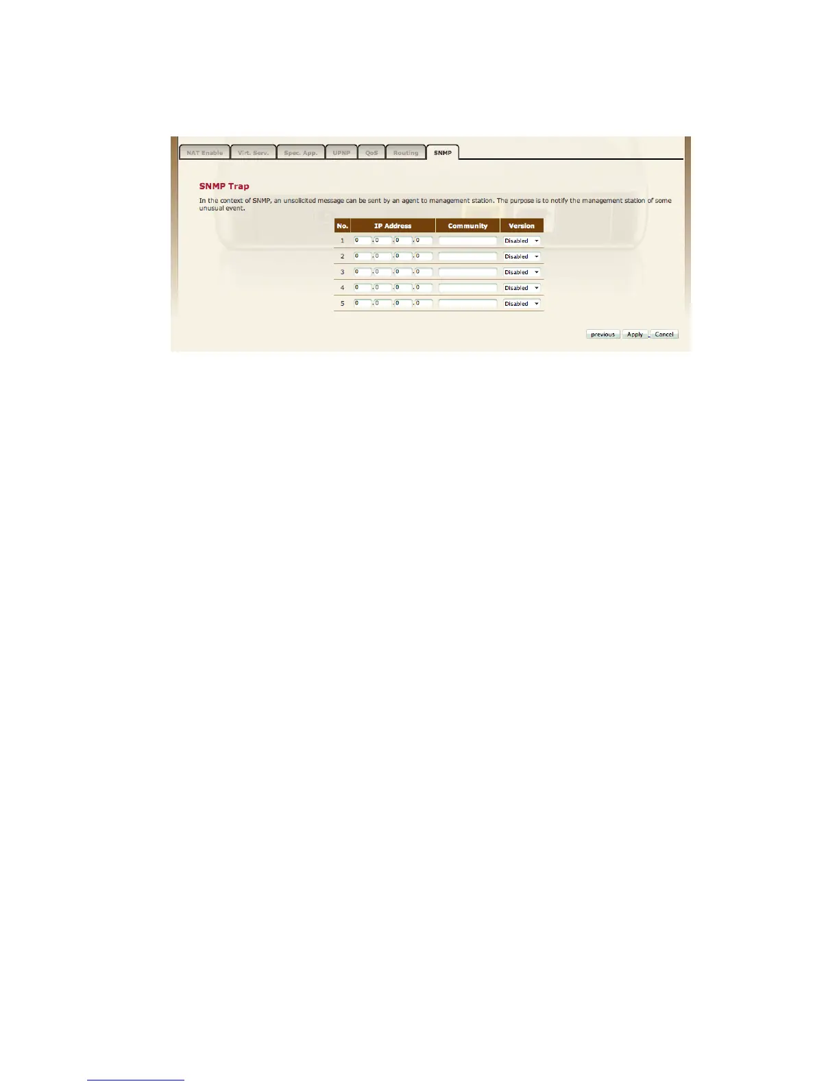 Version Sets the trap status to disabled, or enabled with V1 or V2c. The v2c
