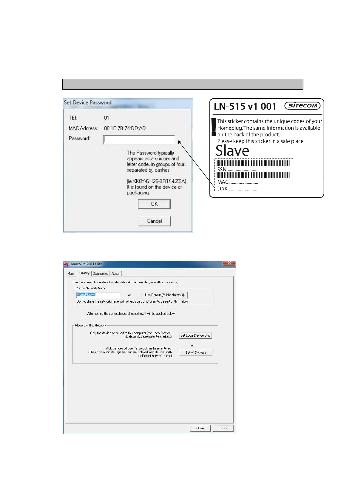 Select the ‘Privacy’ tab in the Homeplug utility. Fill in a chosen network name in