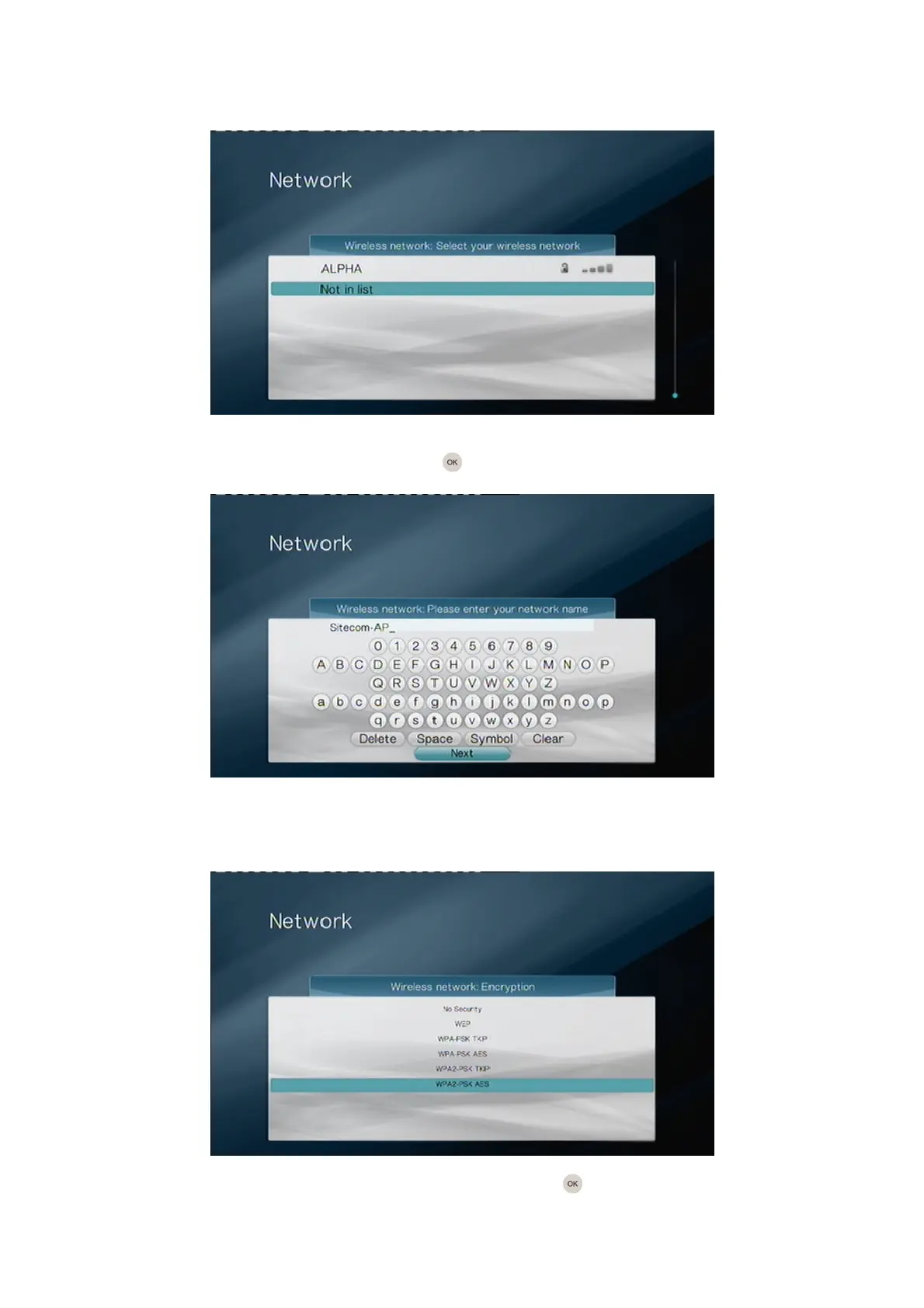 Select the security type of the network and press the OK button on the remote