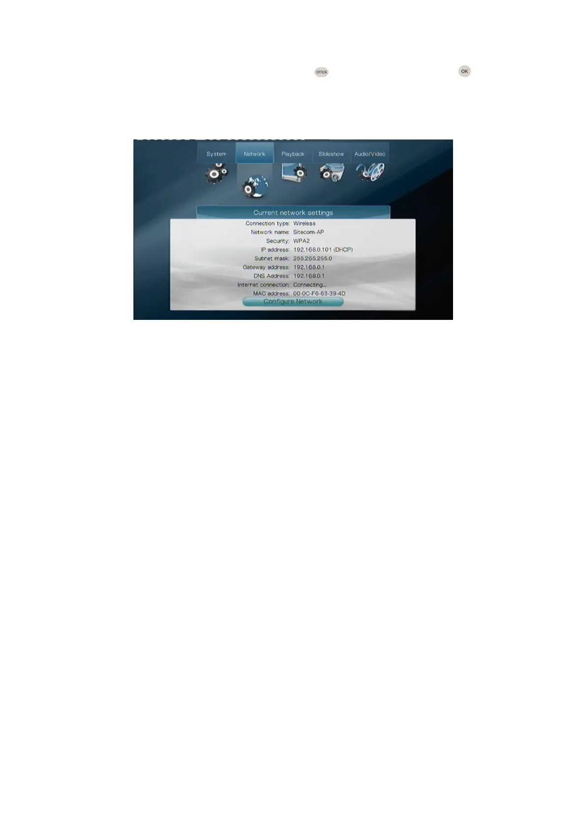 connection in the Network settings page.