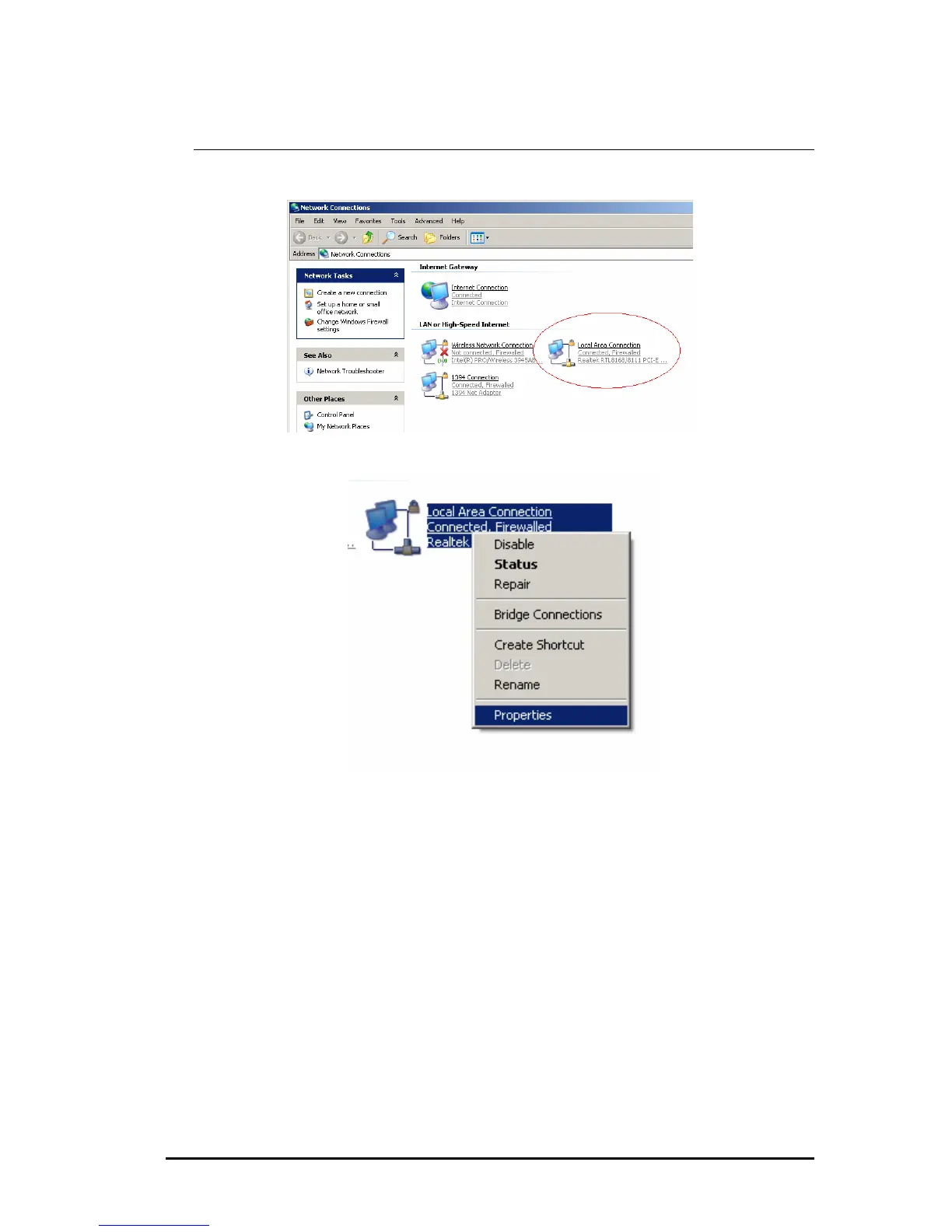 Select [Local Area Connection]) icon=>select [properties]