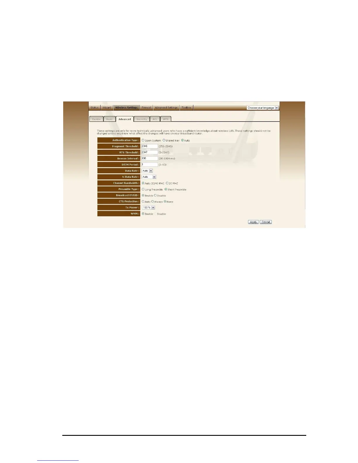 This tab allows you to set the advanced wireless options. The options included