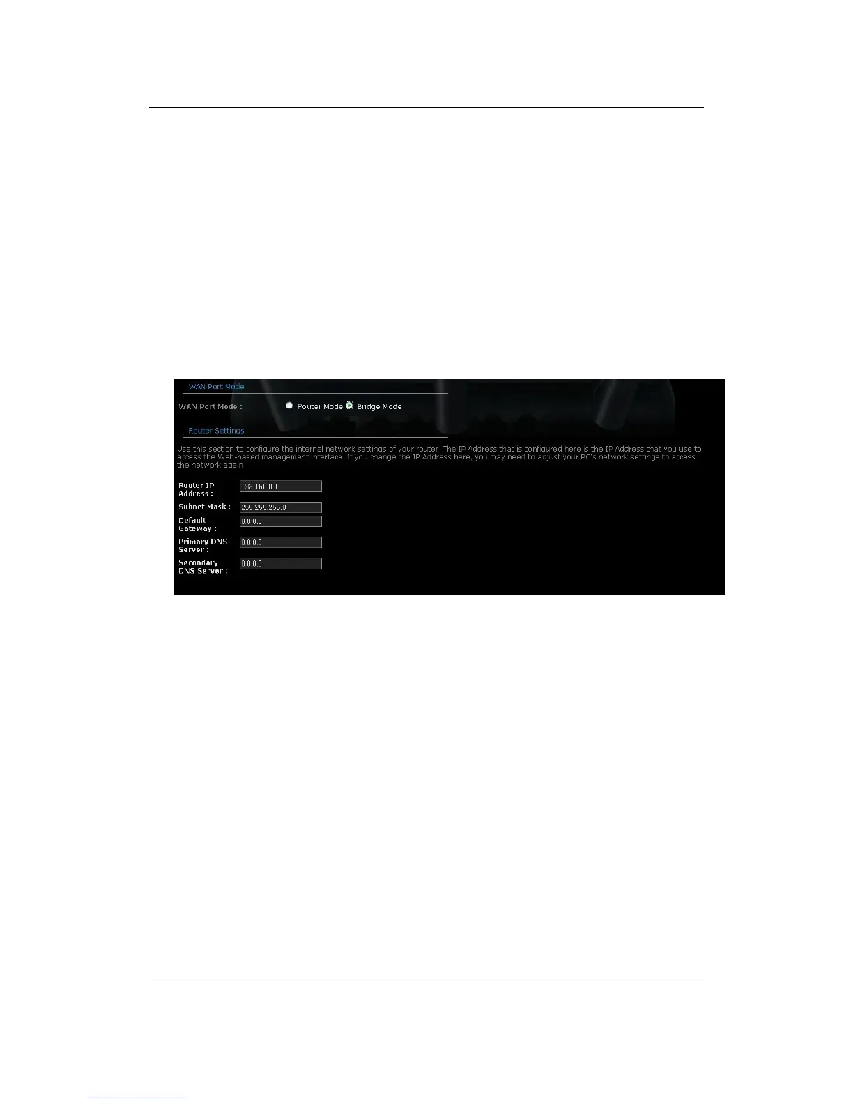 WAN Port Mode: Select the Bridge Mode radio button.