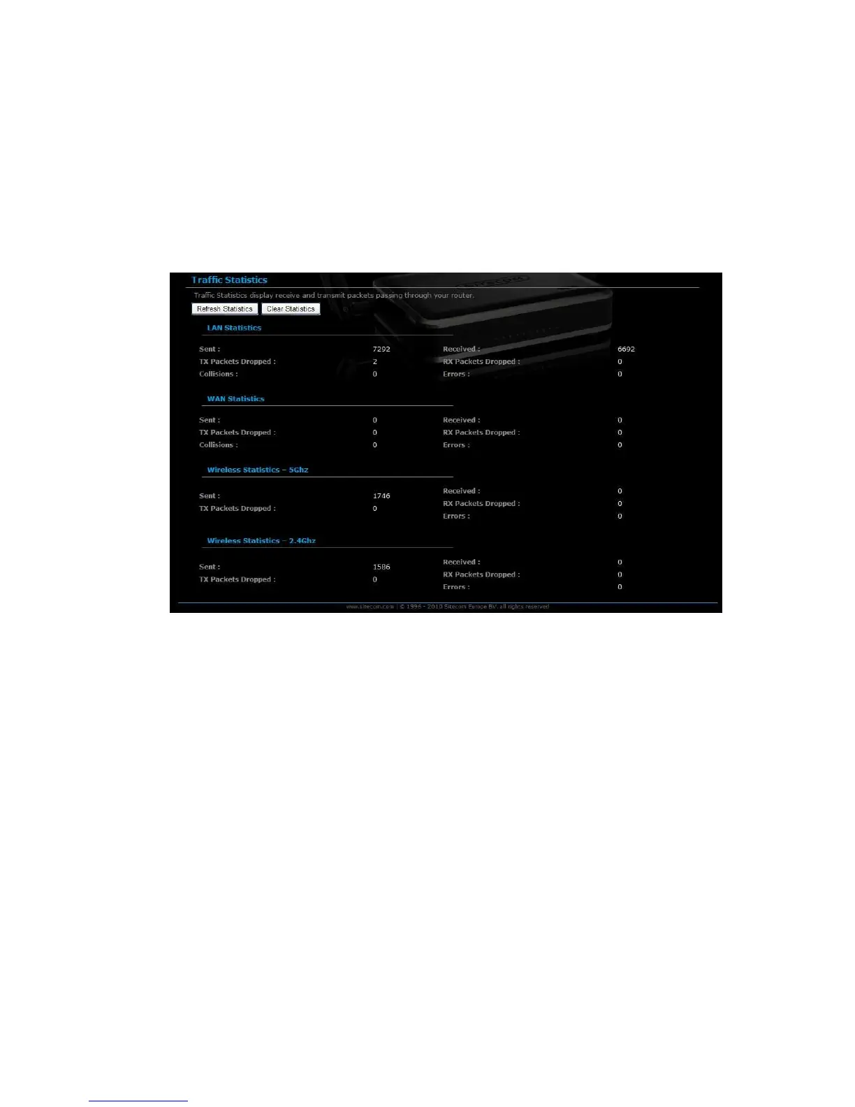 transmitted and received packet statistics of the wired (LAN & WAN) and wireless