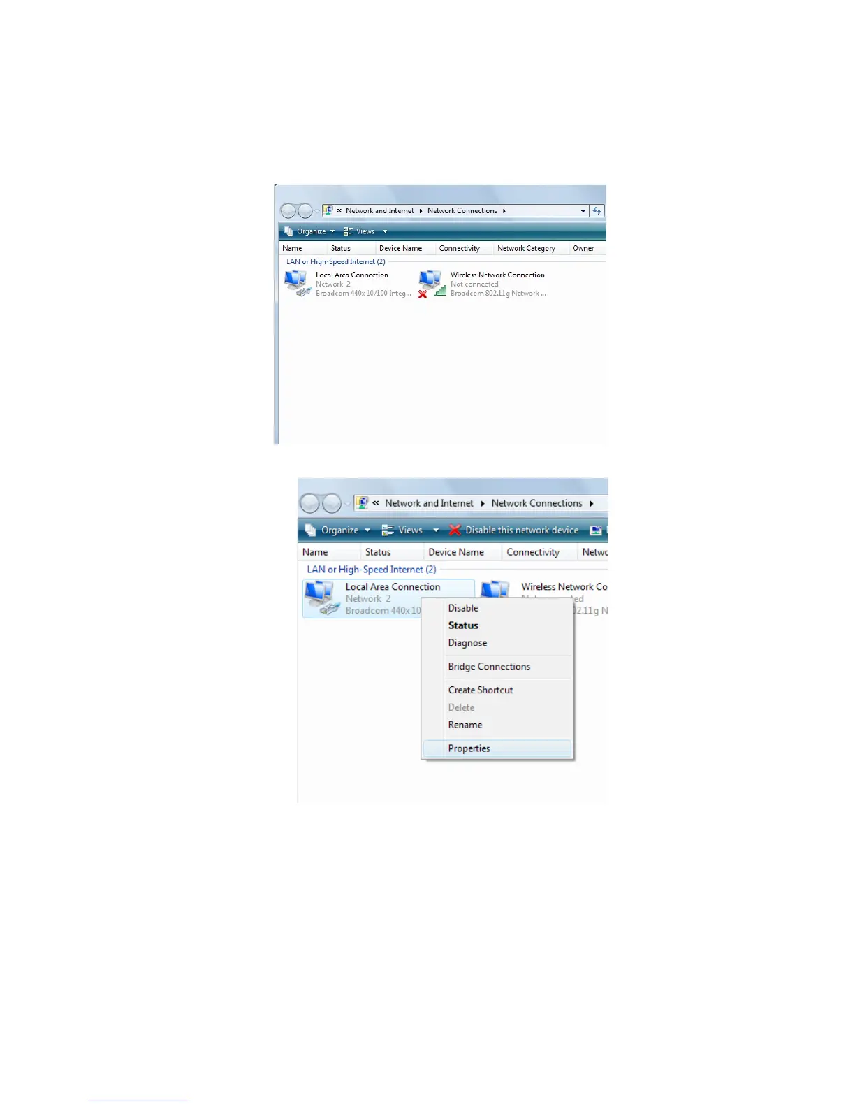 Select [Local Area Connection]) icon=>select [properties]