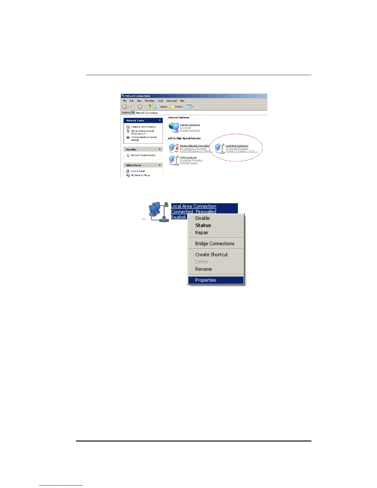 Select [Local Area Connection]) icon=>select [properties]