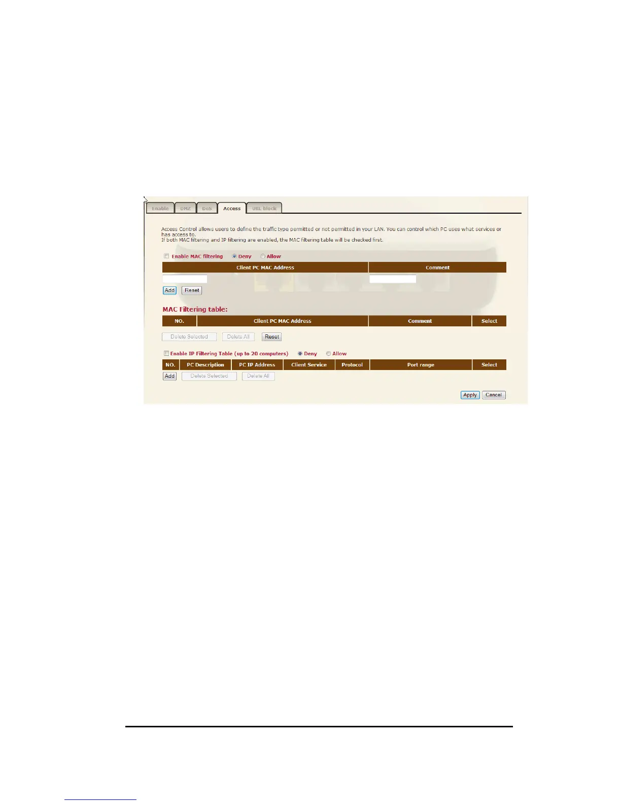Deny If you select “Deny” then all clients will be allowed to access Internet