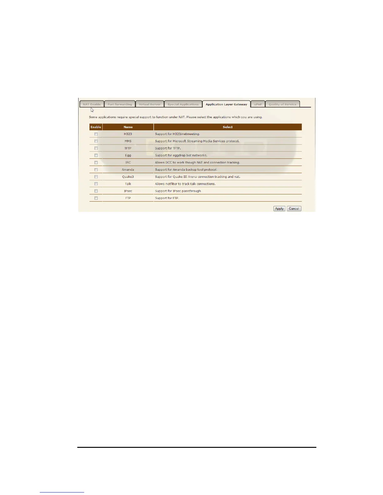 You can select applications that need “Application Layer Gateway” support.