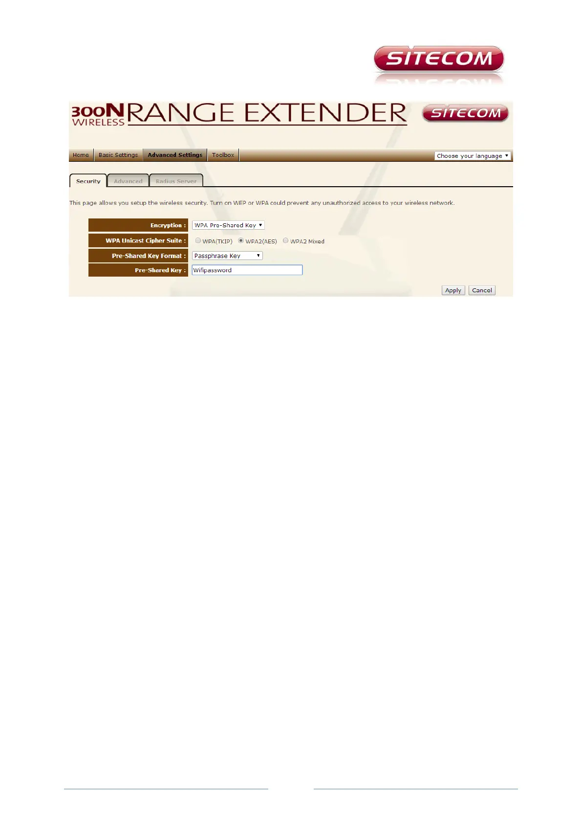 access point. Sitecom always recommends making use of the WPA Pre-Shared Key standard. For the