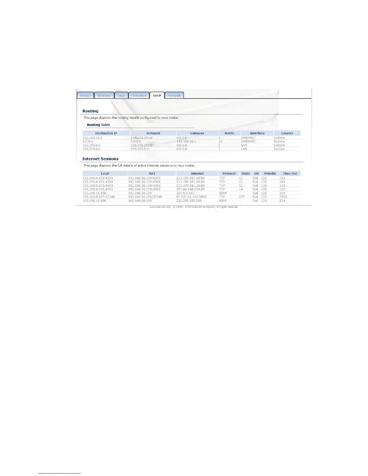 Click on the DHCP link in the navigation menu. This page displays the routing