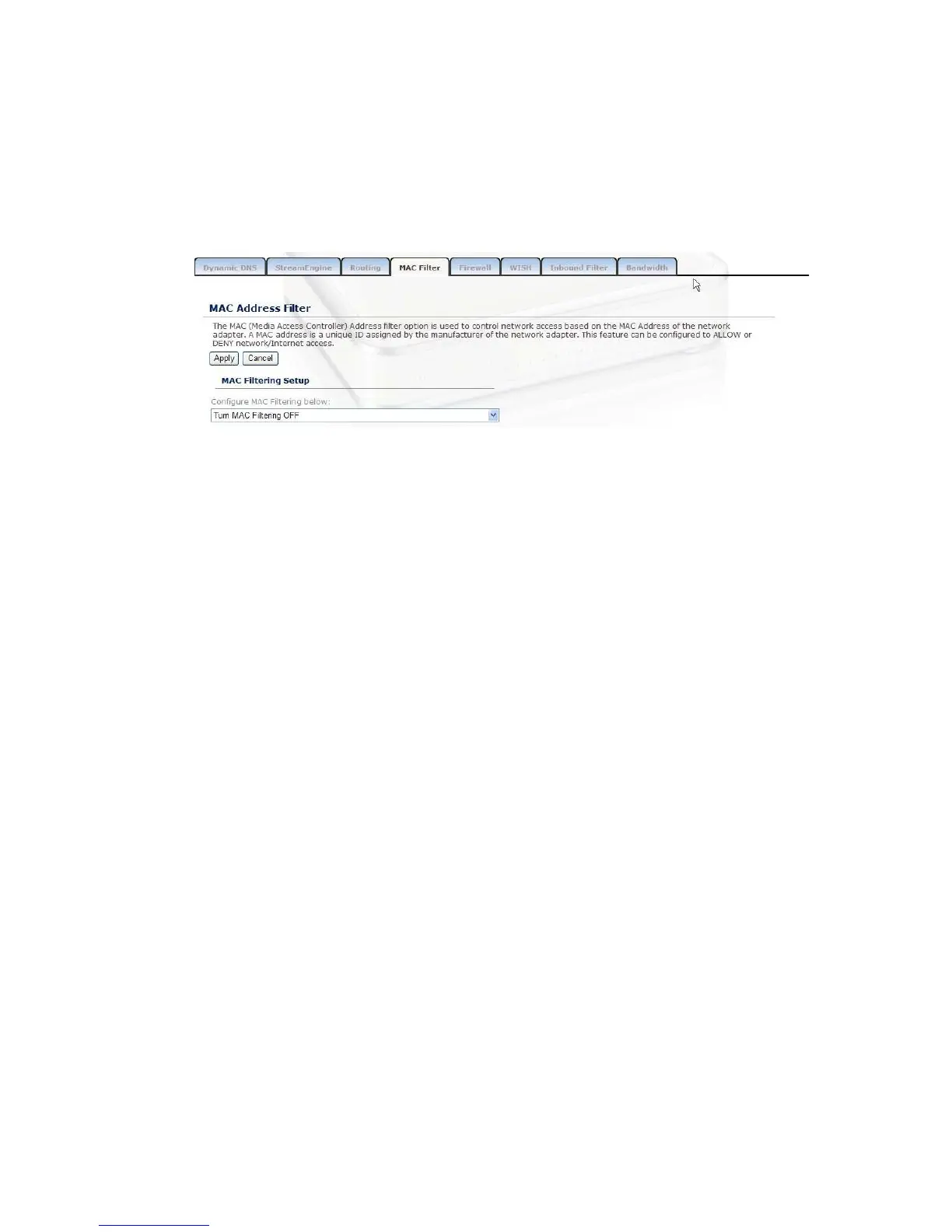 Configure MAC Filtering: Select one of the options from the drop-down list.