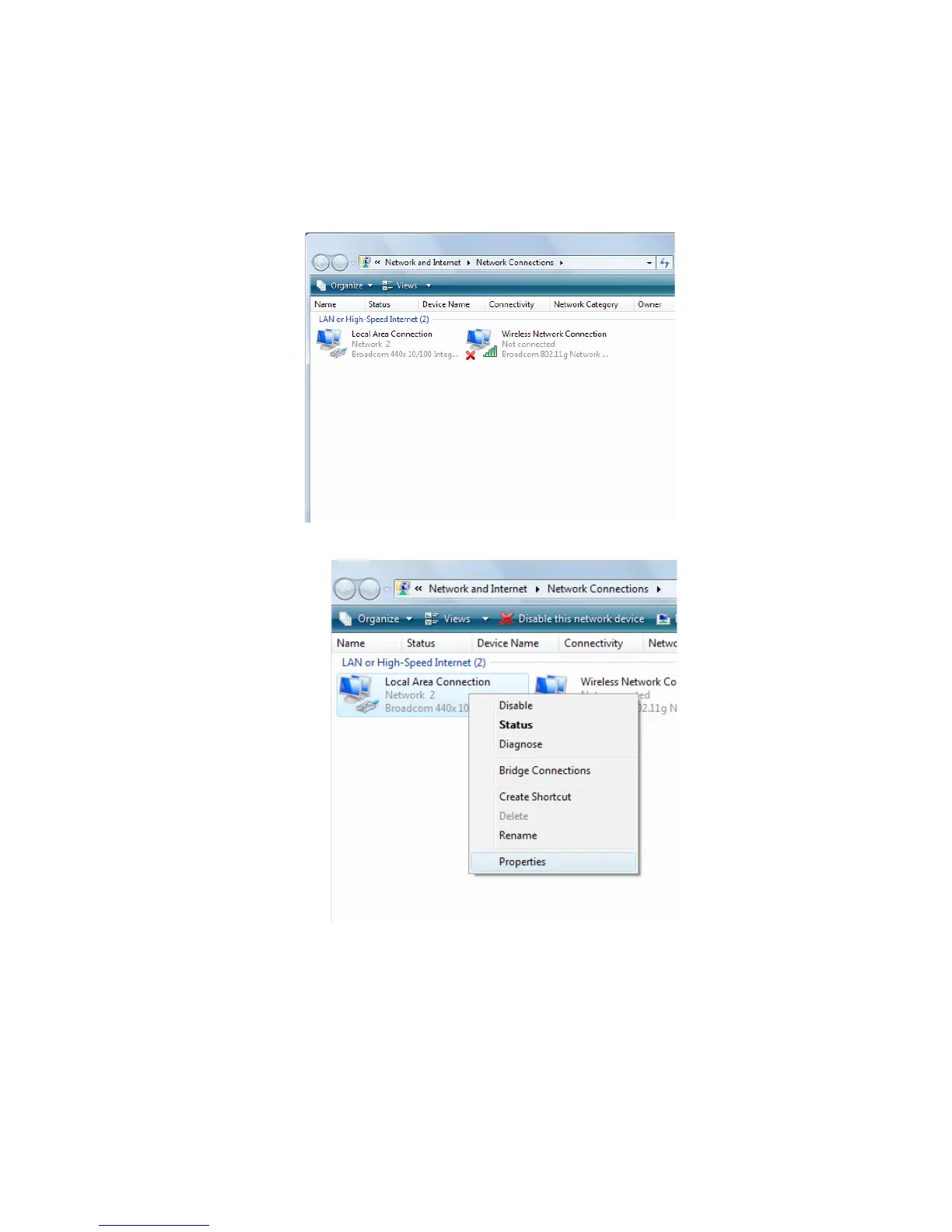 Select [Local Area Connection]) icon=>select [properties]