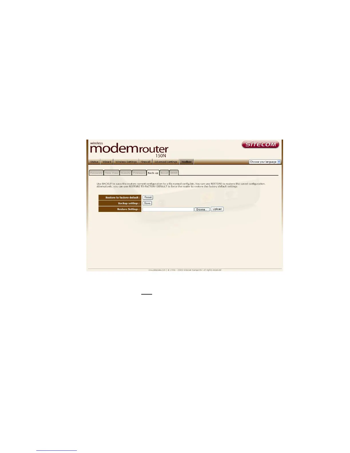 The Backup screen allows you to save (Backup) the router’s current