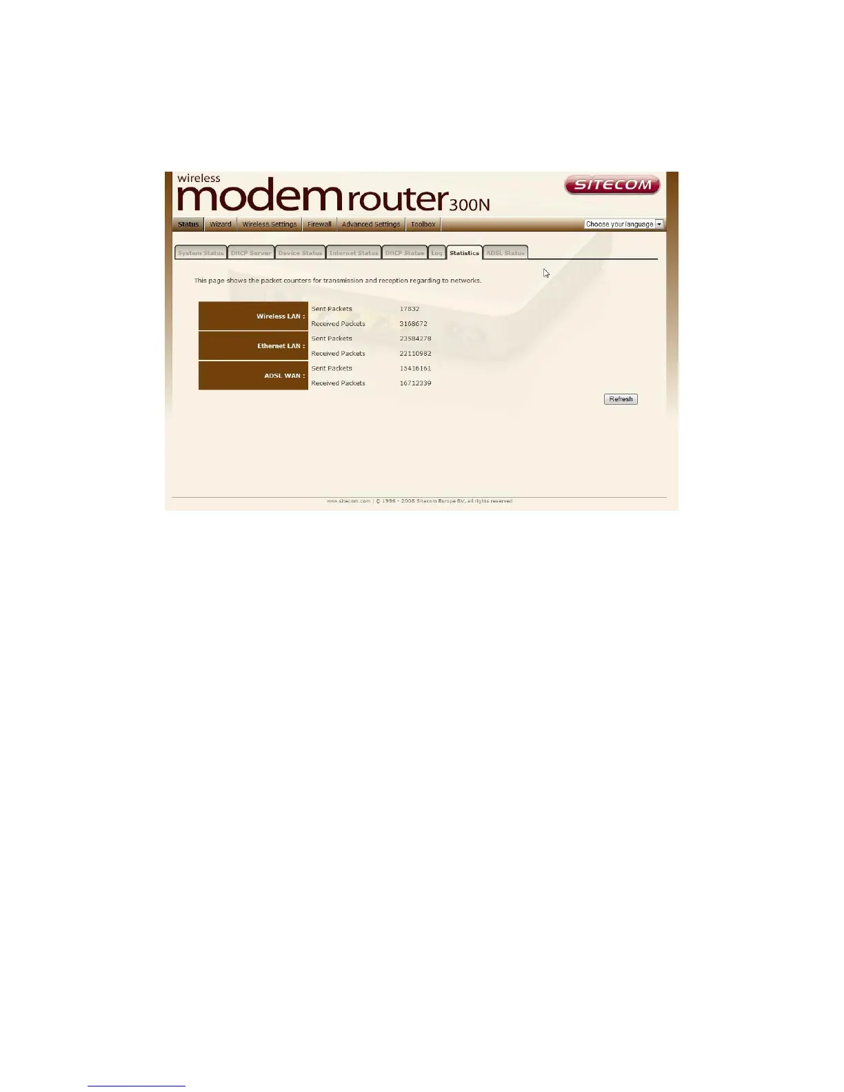 This page shows the statistics for the wireless, LAN, and WAN interfaces.